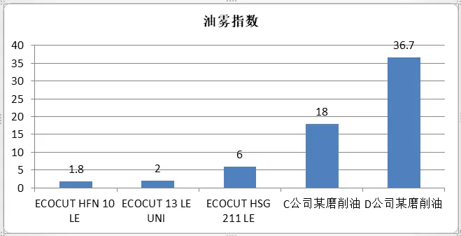 實驗室可以通過油霧指數來表征油品的油霧性能,油霧指數是指一定機械加工條件下,所測定潤滑油的油霧濃度與參比油的油霧濃度的比值,乘以100即為油霧指數。圖一是福斯ECOCUT磨削油與某進口品牌油霧指數對比,從圖中可以看出,福斯ECOCUT低油霧磨削油遠遠低于其它競品。